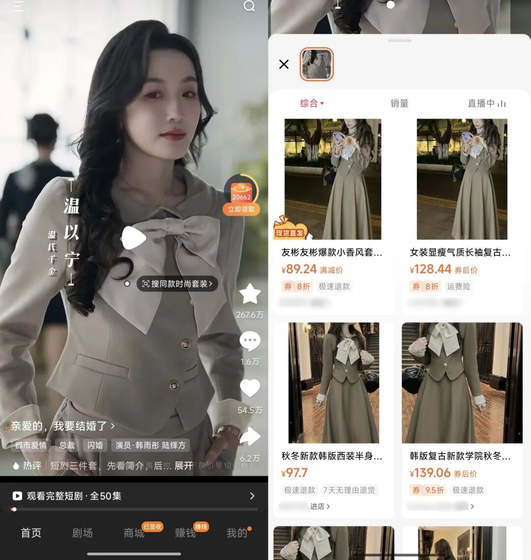 短剧有情节、有冲突,比短视频和直播更容易让人沉浸。如果在剧情高潮时,恰到好处地弹出一个商品链接(比如主角同款衣服、手办),用户更容易因为情绪上头而下单,而不是因为便宜。